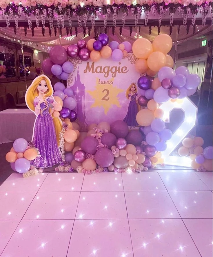 La decoración de cumpleaños Rapunzel destaca por su paleta de colores suaves —lila, rosado, dorado y verde—, creando un ambiente mágico y elegante. Puedes elegir una decoración sencilla de Rapunzel con globos y flores naturales o una puesta en escena completa con torre, faroles flotantes y backdrop de cuento de hadas.