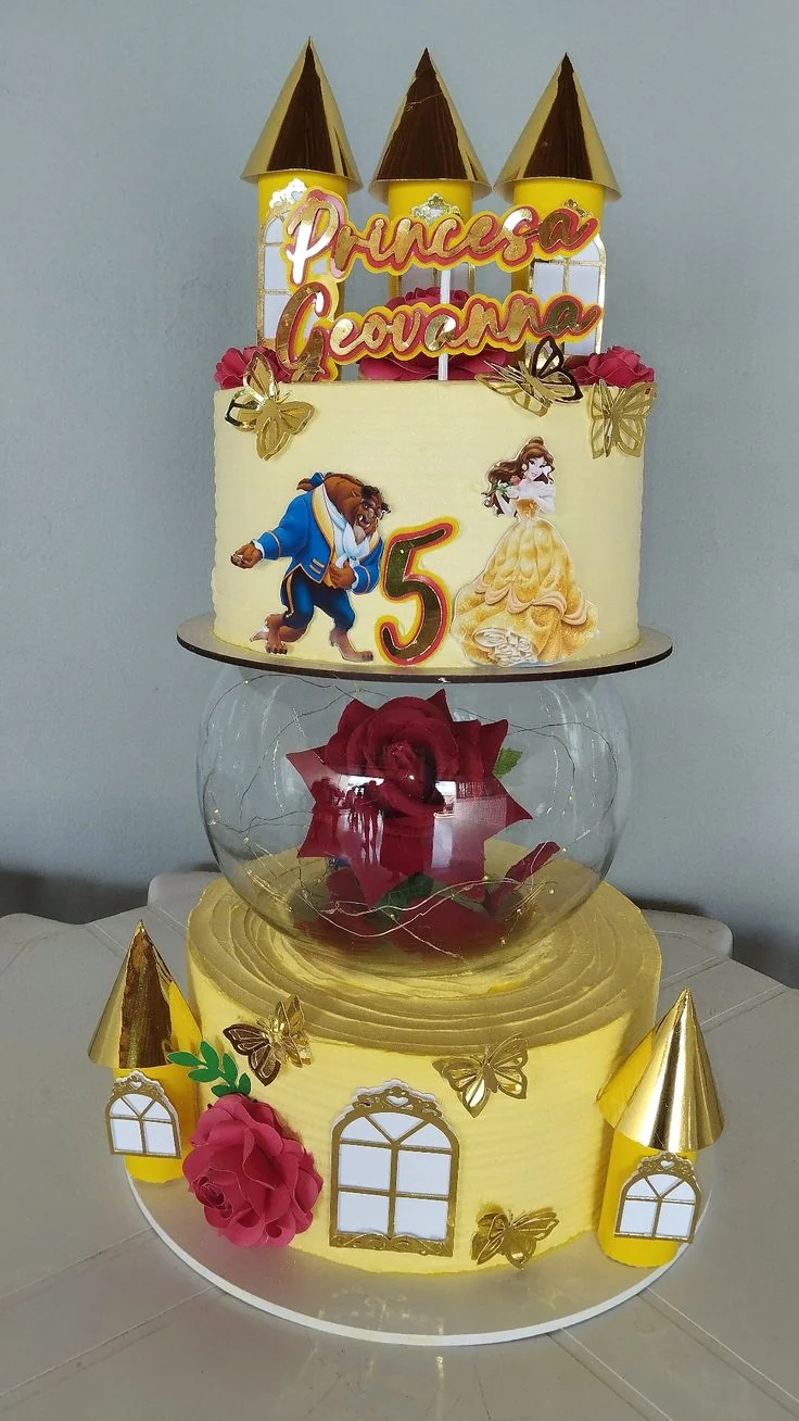 Las tortas Bella y la Bestia sencillas son ideales para celebraciones más íntimas: suaves tonos dorados, detalles florales y la icónica rosa en el centro. En cambio, las versiones más elaboradas pueden incluir el castillo encantado, la pareja bailando, o los personajes Lumière, Chip y la Señora Potts.