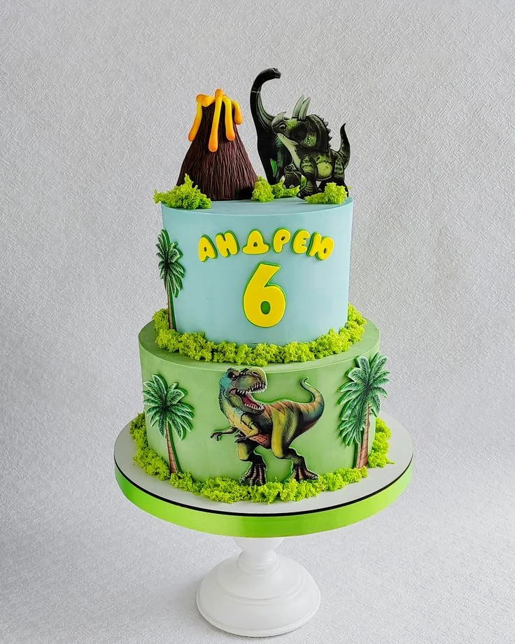 Torta de dinosaurios de dos pisos con fondant verde, hojas tropicales, volcán y figuras de T-Rex y triceratops