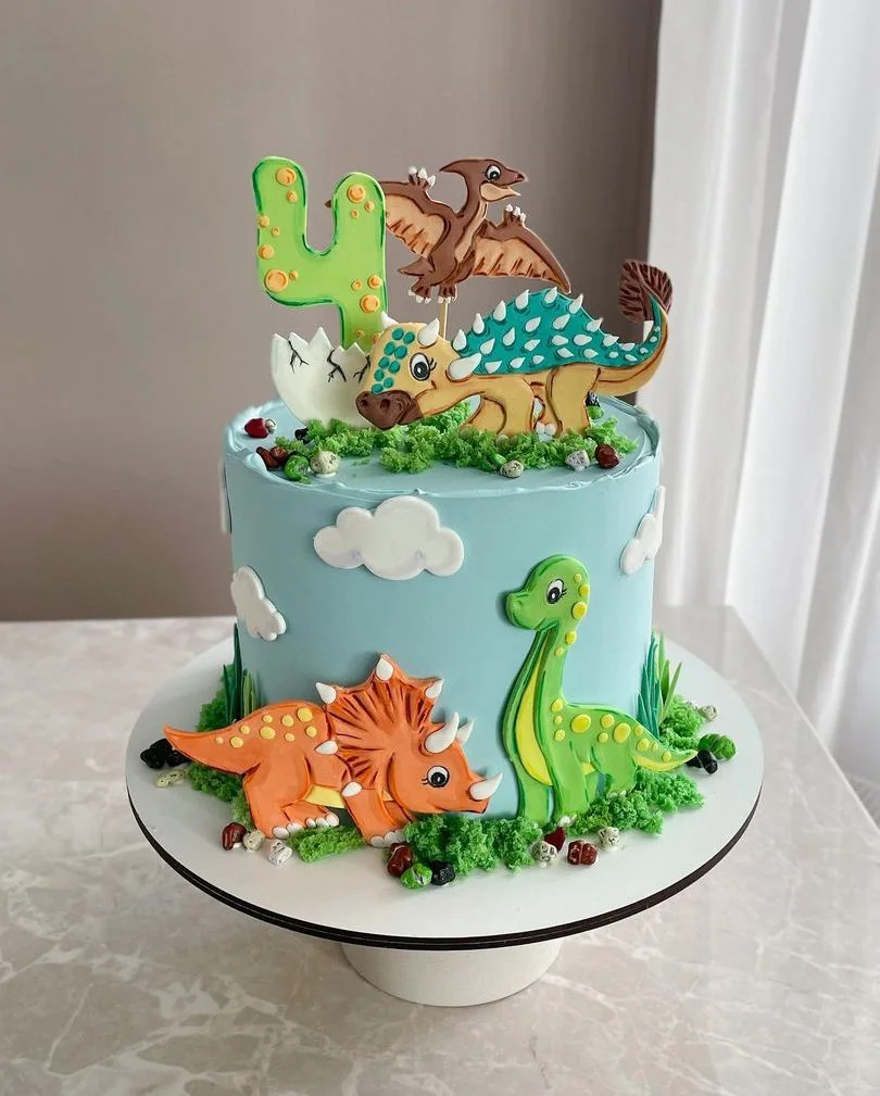 Las tortas de cumpleaños de dinosaurios se caracterizan por sus colores naturales —verde, marrón, naranja y beige—, evocando la selva prehistórica. Puedes optar por una torta dinosaurios sencilla, decorada con crema y toppers de cartón, o una torta dinosaurios fondant con figuras 3D, huellas, rocas y árboles que hacen sentir que los dinosaurios están vivos.