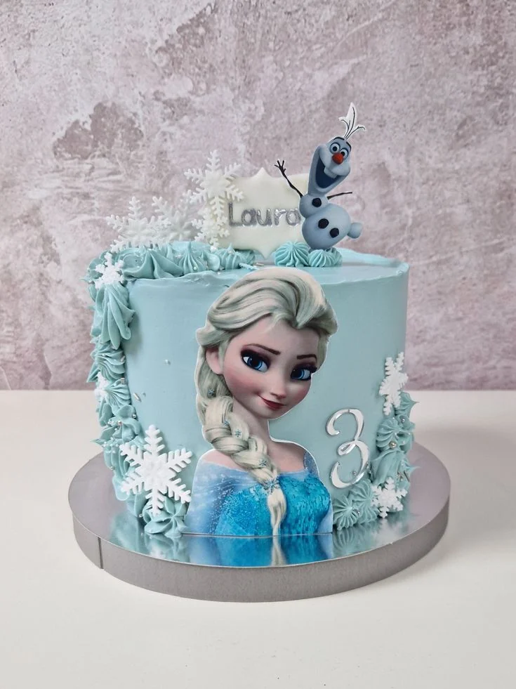 Torta sencilla Frozen con crema azul, topper de Elsa y detalles plateados de copos de nieve