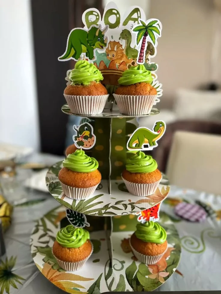 Los dulces personalizados de dinosaurios —como galletas en forma de huella, cupcakes con toppers de triceratops y gomitas de colores— convierten la mesa en el punto más divertido de la fiesta.