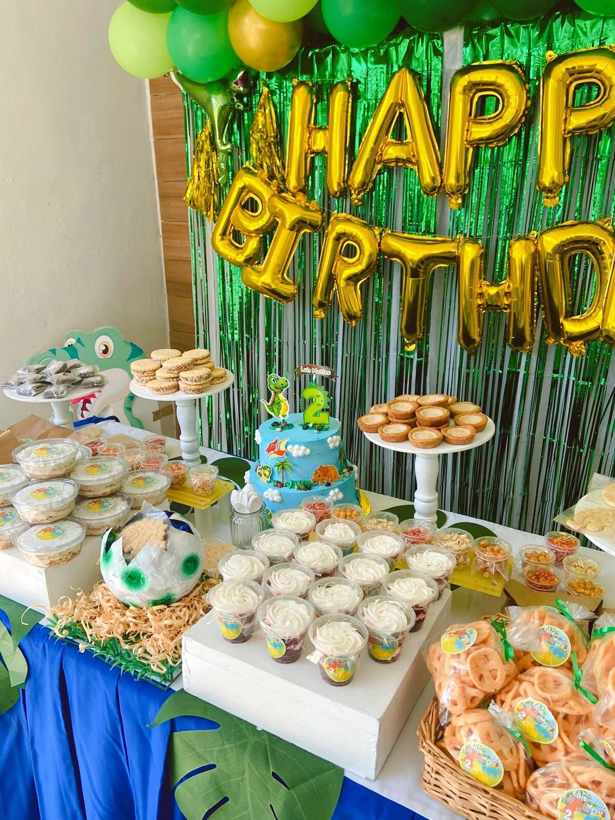 Puedes optar por un candy bar de dinosaurios sencillo para celebraciones en casa, o una versión más completa con arco de globos, fondo de selva y una torta dinosaurio al centro.