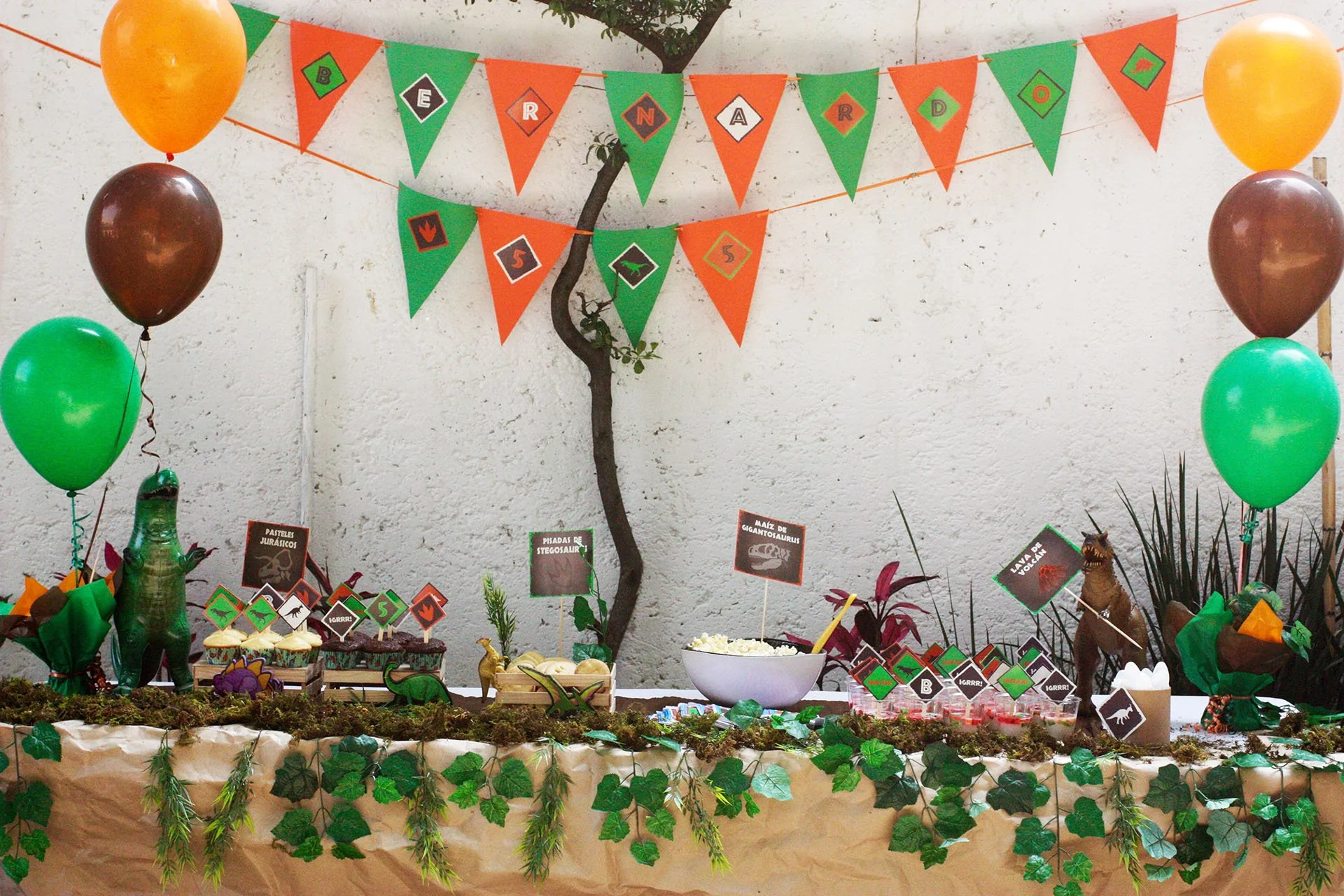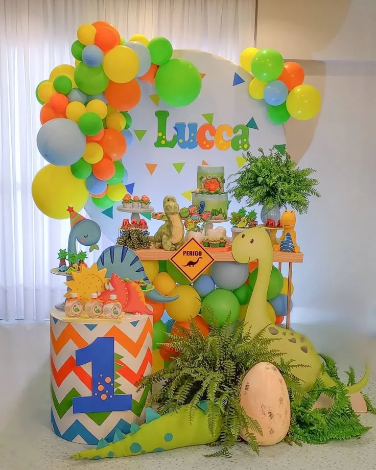 La decoración de cumpleaños de dinosaurios combina tonos verdes, marrones y anaranjados con elementos naturales como hojas tropicales, madera y globos que simulan una jungla prehistórica. Ideal tanto para interiores como para celebraciones al aire libre, esta temática encanta a los pequeños exploradores y fanáticos de los dinosaurios.
