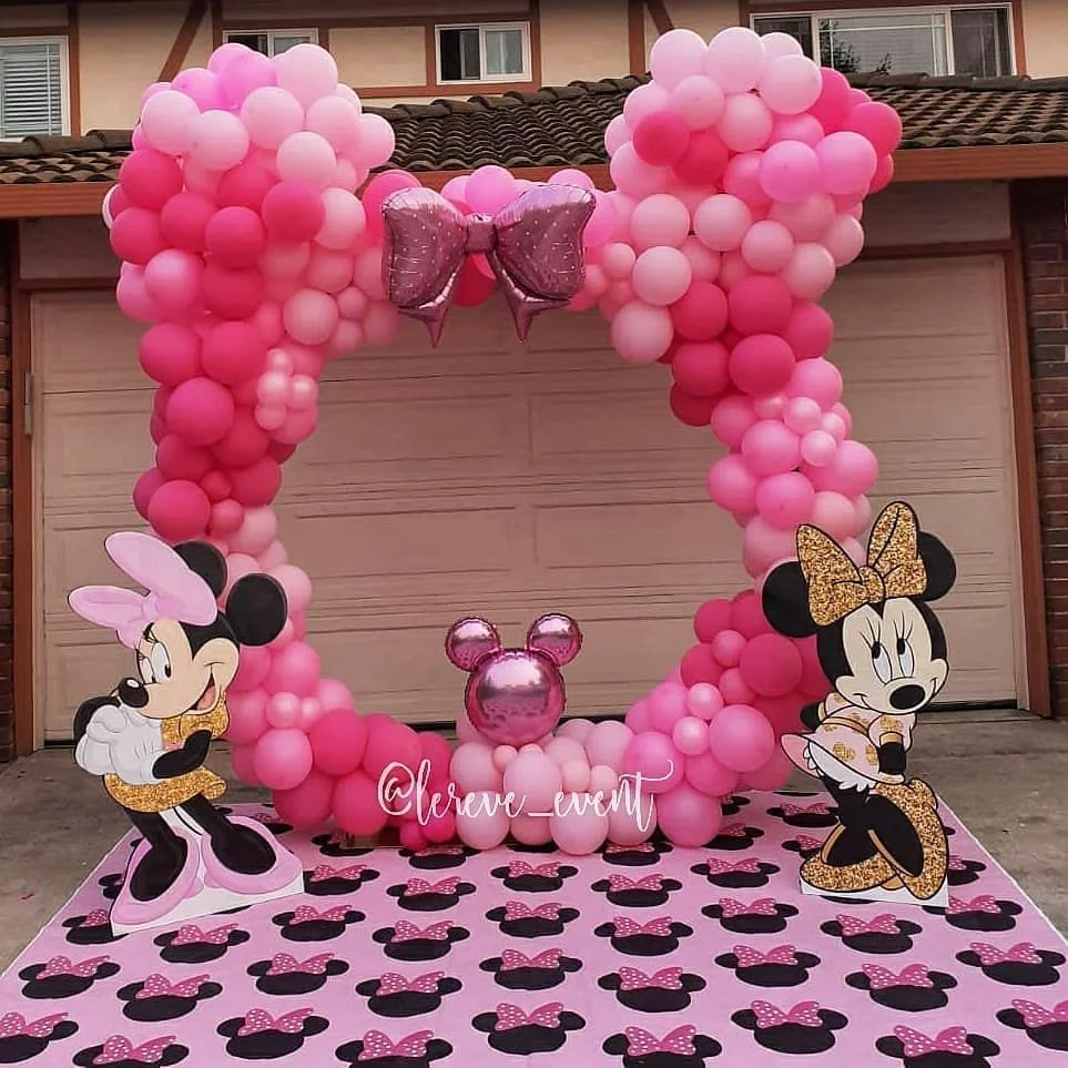 La decoración de cumpleaños de Minnie se caracteriza por sus tonos rosados, blancos, negros y dorados, junto con el clásico moño de lunares que todos reconocen. Puedes elegir una decoración de Minnie sencilla para un festejo íntimo o una ambientación completa con arco de globos, candy bar y mesa decorada con todos los detalles.