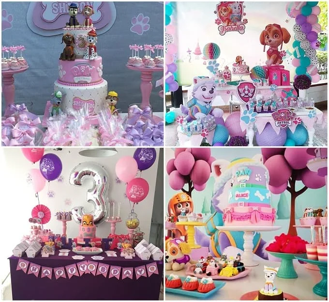 Si buscas un toque especial, la decoración Skye Paw Patrol es una de las favoritas entre las niñas: tonos rosados, lilas y celestes para una versión dulce y encantadora de esta heroína alada.