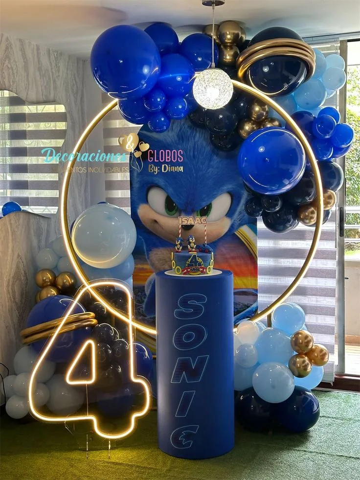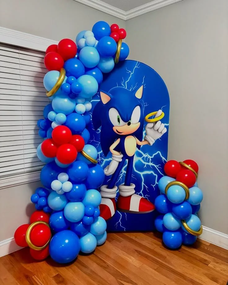 La decoración de cumpleaños de Sonic destaca por sus colores intensos —azul eléctrico, rojo y dorado— que llenan de dinamismo cualquier ambiente. Puedes optar por una decoración de Sonic sencilla si celebras en casa, o una puesta en escena más completa con globos de Sonic, fondo personalizado y mesa de dulces inspirada en los anillos dorados del juego.